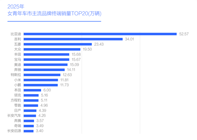 品牌销量也跟着变,2025年年轻女生买得最多的三个品牌是比亚迪、吉利、五菱。吉利靠星愿、熊猫这类小电动,一年卖出34万辆女性用户车,比大众、丰田、本田这些海外品牌都更受女生欢迎。